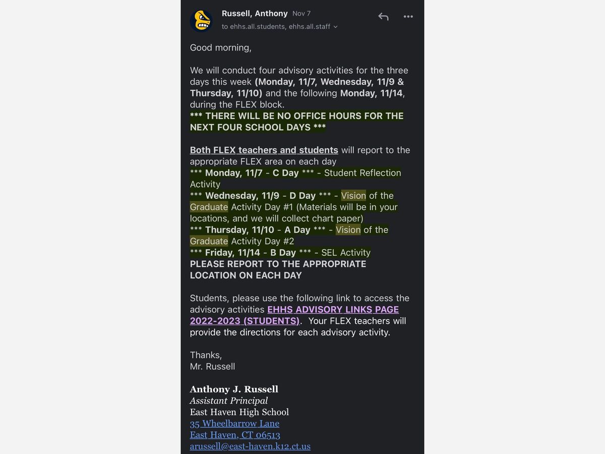 The Vision of the Graduate was implemented by the New England Association of School and Colleges. EHPS then sought the feedback of students, parents, and educators across the district. According to EHHS principal, Mr. Vincent DeNuzzo, “the NEASC comes in and at EHHS every 10 years to evaluate our school and they have a set of standards that the school needs to address. One of their standards is that the school identifies the Vision of the Graduate.” Since one of the NEASC requirements is to have the Vision of the Graduate, EHHS has started to introduce it to the students and teachers.